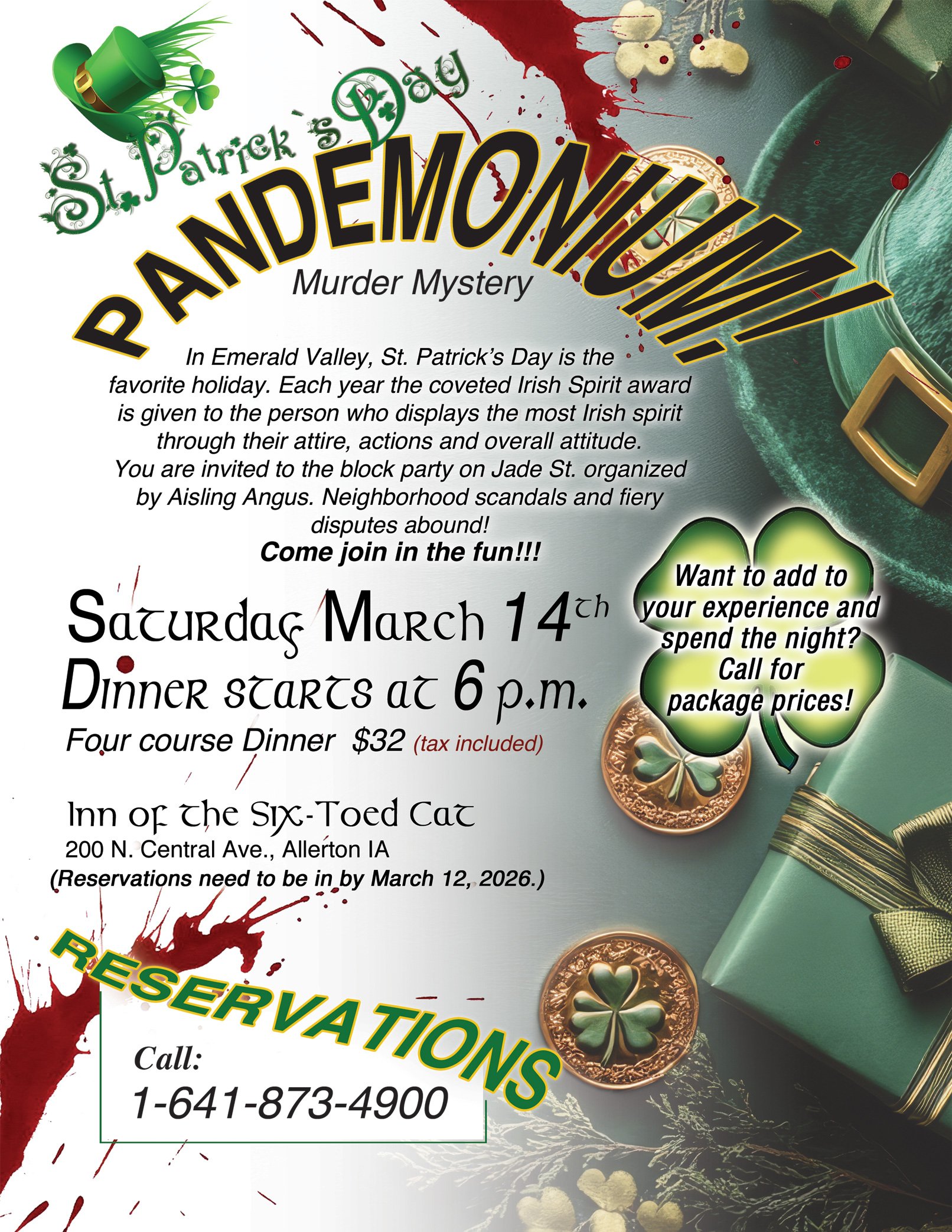 Where: Inn of the Six-Toed Cat, 200 N. Central Ave., Allerton, IA 50008